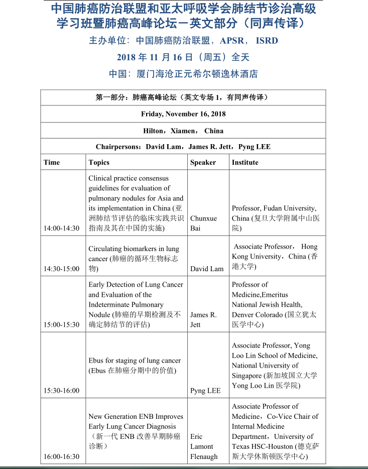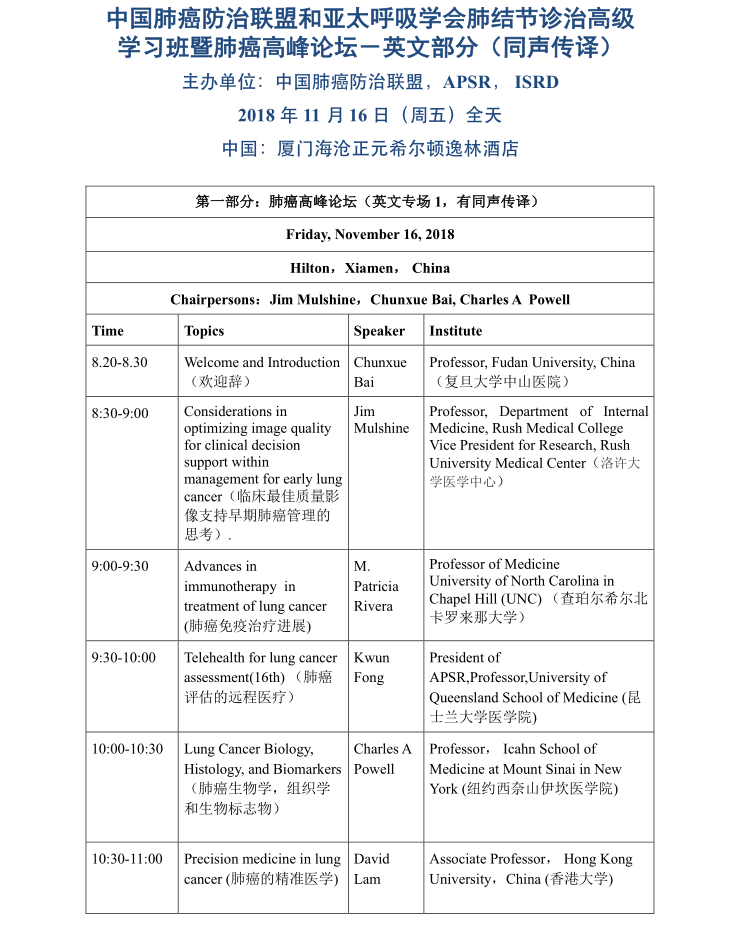 (英文有同声传译)。主办单位:中国健康促进基金会、中国肺癌防治联盟,亚太呼