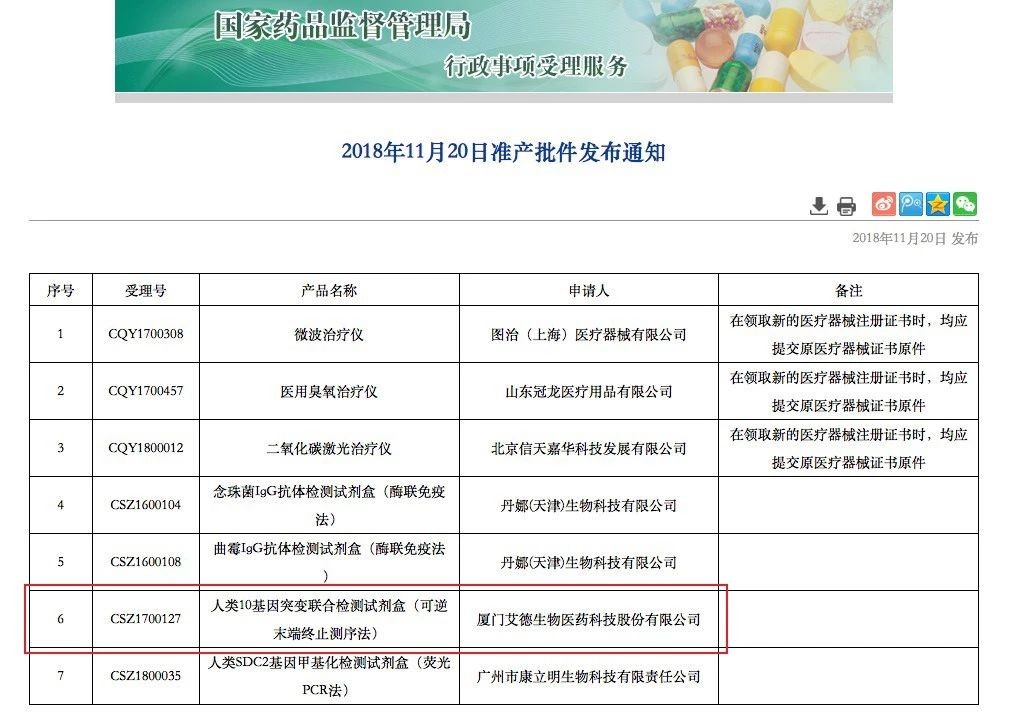 2018年11月20日,国家药品监督管理局批准了艾德生物(股票代码:300685)的“人类10基因突变联合检测试剂盒”(维惠健?)上市。该试剂盒可用于体外检测非小细胞肺癌(NSCLC)及结直肠癌(CRC)患者EGFR、ALK、ROS1、RET、KRAS、NRAS、PIK3CA、BRAF、HER2、MET等10个基因的变异状态,辅助临床医生判断患者从吉非替尼、奥希替尼、克唑替尼、西妥昔单抗等靶向药物中的获益情况。值得关注的是,该产品是目前我国批准的首个跨癌种NGS伴随诊断产品,更覆盖了肺癌、结直肠癌目前已上市所有靶向药物需要检测的基因。