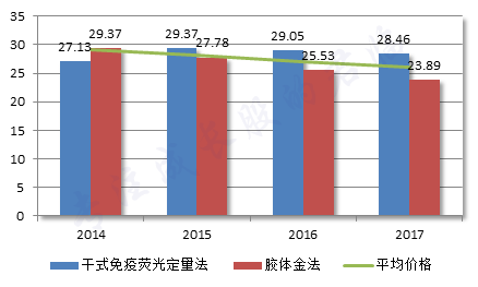 数据显示,2014~2018年间,干式免疫荧光定量法和胶体金法的价格都呈现出逐年下调趋势。