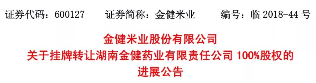 公告显示,2018年11月9日至2018年12月6日,金健米业在长沙联合产权交易所正式挂牌转让药业公司100%的股权,挂牌价格为人民币1元。
