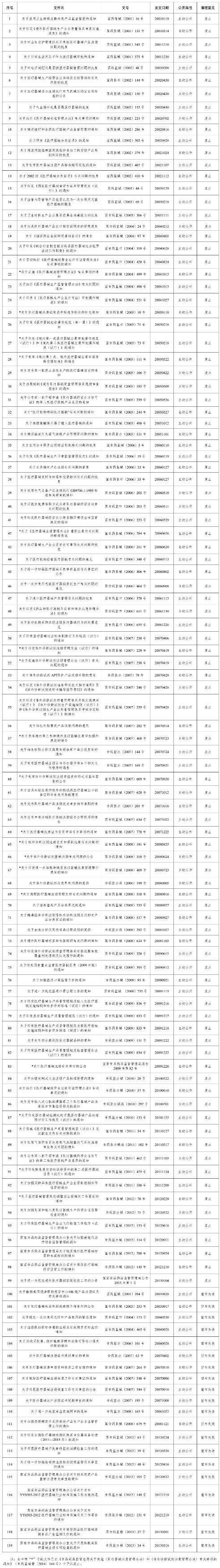 根据中共中央、国务院印发的《法治政府建设实施纲要(2015—2020年)》的要求,为做好药品监管法律制度“立改废释”工作,全面推进依法行政,国家药品监督管理局组织对1998—2013年医疗器械规范性文件进行了清理,并决定废止和宣布失效一批规范性文件。现将《国家药品监督管理局继续有效的医疗器械规范性文件目录(1998—2013年)》(附件1)和《国家药品监督管理局废止和宣布失效的医疗器械规范性文件目录(1998—2013年)》(附件2)予以公布。