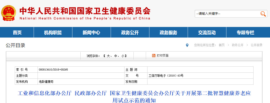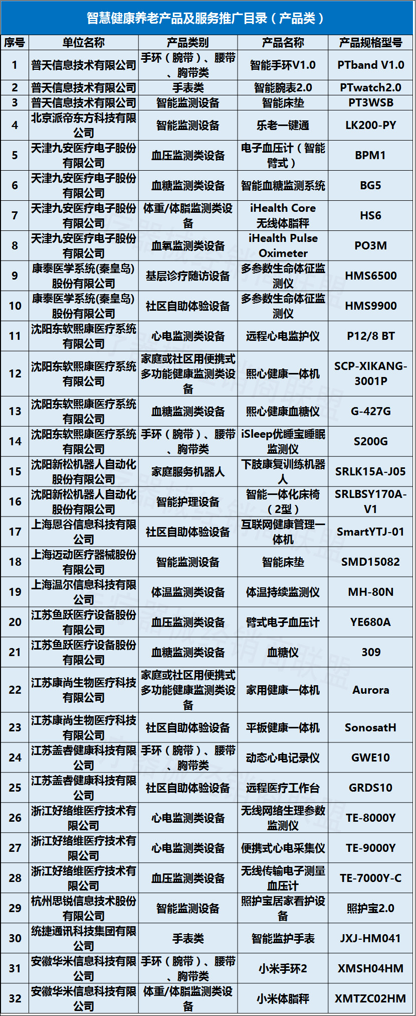 而就在不久前,国家卫健委、工信部、民政部联合发布《智慧健康养老产品及服务推广目录(2018年版)》,这也是第一批智慧健康养老示范企业名单公布。