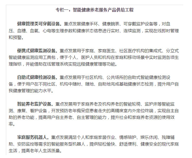 其中就包括支持建设一批示范企业,包括能够提供成熟的智慧健康养老产品、服务、系统平台或整体解决方案的企业。