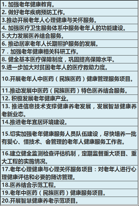原国家卫计委文件一共提出了20项健康老龄化的规划重点和具体分工。包括: