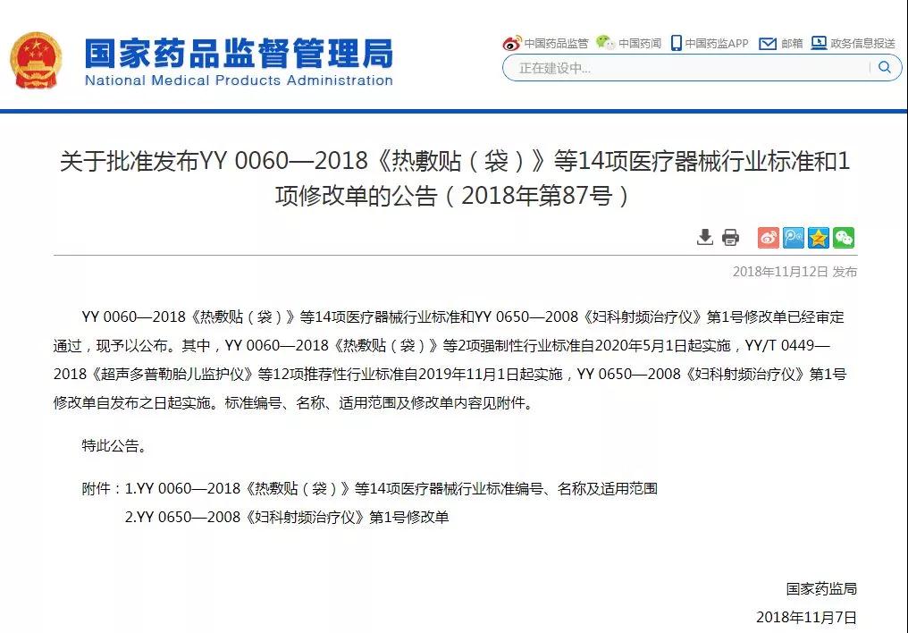 YY 0060—2018《热敷贴(袋)》等14项医疗器械行业标准编号、名称及适用范围 01 >>> YY 0060-2018 <<< 《热敷贴(袋)》 标准介绍 本标准规定了热敷贴(袋)的术语和定义、分类、要求、试验方法。 适用范围 本标准适用于将主要材料成分(铁粉、水、活性碳、食盐等,且不含任何药物成分),按一定比例放入内袋密封,利用铁粉氧化的升温致热原理,通过热传导作用方式对患者进行辅助治疗的贴敷类产品。对于多功能敷贴类产品(如具有磁疗、远红外等功能),其他功能如有相应的国家标准和/或行业标准,也应符合其他相关标准的要求。 不适用范围 含有化学成分、中药材(或天然植物)及其提取物等,所含成分发挥药理学、免疫学或者代谢作用的贴敷类产品;含有化学成分、中药材(或天然植物)及其提取物等,不能证明其所含产品不发挥药理学、免疫学或者代谢作用的贴敷类产品。 版本迭代 本标准代替YY 0060—1991《热敷灵》。 02 >>> YY 0585.3-2018 <<< 《压力输液设备用一次性使用液路及附件第3部分:过滤器》 标准介绍 本标准规定了压力输液设备用过滤器的设计、材料、物理、化学和生物学、包装、标签、处置等要求,不包括过滤器滤除微粒或细菌的有效性。 适用范围 本标准适用于不超过200 kPa压力的输液设备用液路和YY 0286.4规定的输液器上用一次性使用无菌输液过滤器。 版本迭代 本标准代替YY 0585.3—2005《压力输液设备用一次性使用液路及附件第3部分:过滤器》。 03 >>> YY/T 0449-2018 <<< 《超声多普勒胎儿监护仪》 标准介绍 本标准规定了超声多普勒胎儿监护仪的术语和定义、要求、试验方法和检验规则。 适用范围 本标准适用于超声多普勒胎儿监护仪,该产品采用连续波或脉冲波超声多普勒原理,在围产期对胎儿进行连续监护,并在出现异常时及时提供报警信息。 版本迭代 本标准代替YY 0449—2009《超声多普勒胎儿监护仪》。 04 >>> YY/T 0590.1-2018 <<< 《医用电气设备数字X射线成像装置特性第1-1部分:量子探测效率的测定普通摄影用探测器》 标准介绍 本标准规定了在制造商规定的医疗使用条件下工作的,以空气比释动能和空间频率为函数的数字X射线成像装置的量子探测效率(DQE)的测定方法。本标准的目标用户为制造商或装备精良的检测实验室。 适用范围 本标准的适用范围限于单次曝光成像的数字X射线成像装置,例如,但不仅限于CR系统、基于直接或间接平板探测器的系统。不推荐YY/T 0590系列标准用于基于影像增强器的X射线成像系统。 不适用范围 使用在乳腺摄影或牙科摄影的数字X射线成像装置;线扫描数字X射线成像装置;计算机体层摄影设备;动态成像装置(在该系统中一系列影像被采集到,例如透视和心脏成像)。 版本迭代 本标准代替YY/T 0590.1—2005《医用电气设备数字X射线成像装置特性第1部分:量子探测效率的测定》。 05 >>> YY/T 0609-2018 <<< 《医用诊断X射线管组件通用技术条件》 标准介绍 本标准规定了医用诊断X射线管组件的术语和定义、分类、要求及试验方法。 适用范围 本标准适用于医用诊断X射线管组件(包括组合式X射线管组件),该产品供医用诊断X射线设备配套使用。 版本迭代 本标准代替YY/T 0609—2007《医用诊断X射线管组件通用技术条件》。 06 >>> YY/T 0616.3-2018 <<< 《一次性使用医用手套第3部分:用仓贮中的成品手套确定实际时间失效日期的方法》 标准介绍 本标准规定了用以确定在其最终包装中、贮存在典型仓贮条件下的医用手套的货架寿命的研究设计。 适用范围 本标准适用于所有由合成或天然胶乳制成的外科和检查手套。 07 >>> YY/T 0681.14-2018 <<< 《无菌医疗器械包装试验方法第14部分:透气包装材料湿性和干性微生物屏障试验》 标准介绍 本标准规定了湿性条件和干性条件微生物屏障试验的试验方法。 适用范围 本标准给出的试验方法适用于最终灭菌医疗器械的包装材料。 08 >>> YY/T 0734.1-2018 <<< 《清洗消毒器第1部分:通用要求和试验》 标准介绍 本标准规定了自动控制的清洗消毒器及其附件的术语和定义、通用要求、试验方法、标志与使用说明书、包装、运输和贮存等。 适用范围 本标准适用于对可重复使用的医疗器械和对医疗机构等领域的物品进行清洁和消毒的清洗消毒器。处理特殊负载的清洗消毒器的要求和试验由YY/T 0734的其他部分或其他标准规定。 版本迭代 本标准代替YY/T 0734.1—2009《清洗消毒器第1部分:通用要求、术语定义和试验》。 09 >>> YY/T 1615-2018 <<< 《外科植入物钛及钛合金阳极氧化膜通用要求》 标准介绍 本标准规定了外科植入物用钛及钛合金阳极氧化膜的术语、定义及有效面的性能要求、试验方法。 适用范围 本标准适用于根据电解原理,在相应的电解液中,通过外加电场的作用,以钛及钛合金产品为阳极的在表面发生氧化反应的阳极氧化膜。 不适用范围 本标准不适用于以添加非基体元素为目的阳极氧化工艺处理的表面和通过物理或其他化学方法对产品表面进行改性处理的各种表面。 10 >>> YY/T 1616-2018 <<< 《组织工程医疗器械产品生物材料支架的性能和测试指南》 标准介绍 本标准给出了生物材料支架的化学性质和测试方法、物理性质和测试方法、机械性质和测试方法、生物学试验和评价、降解性能和试验、灭菌、质量保证等内容。 适用范围 本标准适用于制备组织工程医疗器械产品的生物材料支架的性能