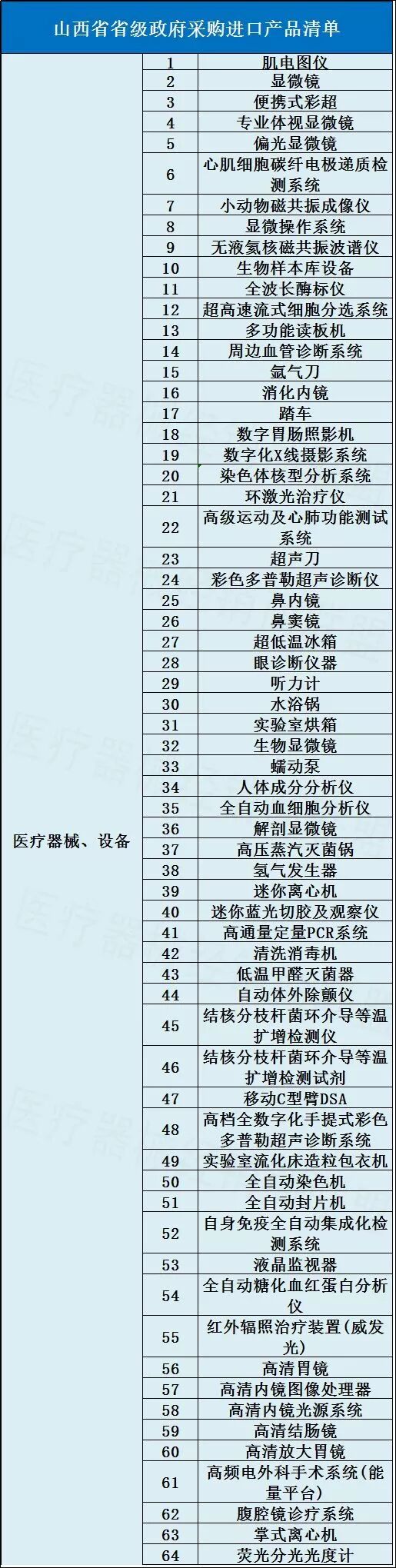 山西省政府采购网发布《山西省省级政府采购进口产品清单》(简称《进口产品清单》),其中67种医用设备产品被纳入允许采购进口清单。