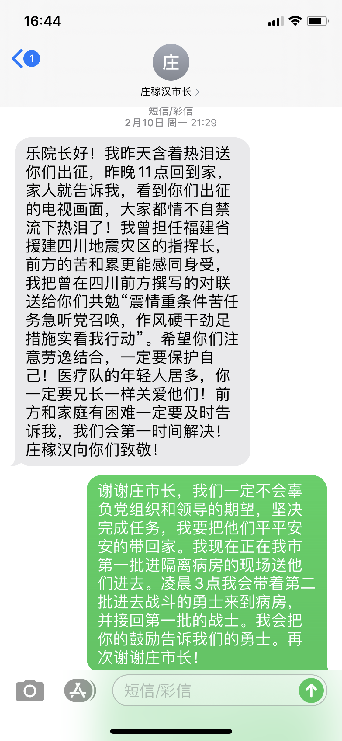 △厦门市市长庄稼汉发给乐家振的慰问短信,当时第一组成员刚刚进入病房