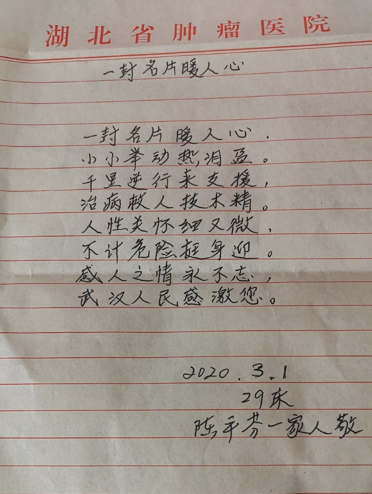 到家的时候已经十二点,她还没有睡着,我告诉她我要去武汉一线了,明天就走。原本以为她会很担心,还特意准备了几句安慰的话。没想到她对我说:“你也该去了,你是个‘湖北佬’,又在武汉读书,现在那边需要你。放心吧,我会照顾好家里的。”