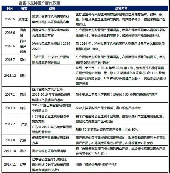 除国家政策层面,2017 年起,政府将浙江、四川、广东、上海、江苏5 省市列入扶持国产医疗设备首批试点推广,可见国家扶持政策逐步落地,进口替代进程有望加快。