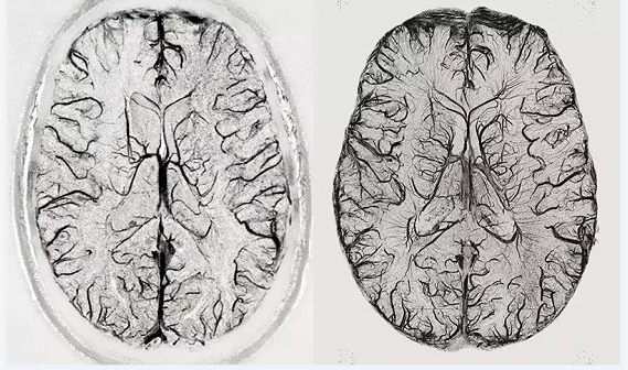 下面是德国马克斯普朗克研究所的9.4T(右)MRI和普通3T MRI扫描统一大脑断面的效果——