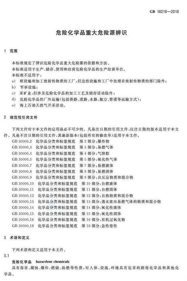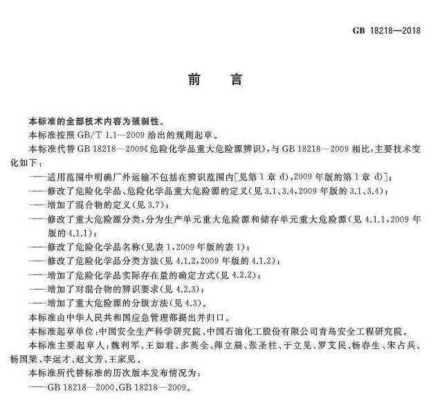 2018年11月19日,市场监管总局 标准委发布2018年第15号公告,批准发布了《危险化学品重大危险源辨识》GB 18218-2018、《危险化学品生产装置和储存设施风险基准》GB 36894-2018等国家标准。《危险化学品重大危险源辨识》 GB 18218-2018,代替标准GB18218-2009,该标准将于2019年03月01日起实施。